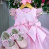 Confeccionado em tecido misto possui forro em poliéster e algodão para não incomodar a criança e proporcionando um caimento incrível e sofisticado, possui gola redonda, comprimento médio, mangas curtas, possui elástico nas costas para melhor ajuste, acabamento com lindo laço na parte posterior do vestido completa o look dos sonhos!